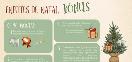 Moldes prontos de enfeites temáticos para personalizar com versículos e mensagens. Imprima, monte com as crianças e decore sua árvore com símbolos que realmente importam.